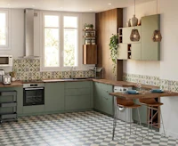 Pour créer une cuisine plus spacieuse et plus esthétique, il fallu repenser et redessiner les espaces. Bobby souhaitait conserver de la couleur, le vert est désormais porté par les façades et dans un ton plus actuels. J’ai décidé de conserver les faïences sol et murs vintages et de les mettre en valeur dans cette cuisine désormais moderne.