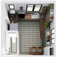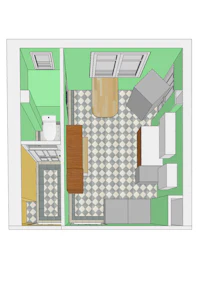 La cuisine de Bobby est dépassée. Les meubles encombrants et mal placés, les rangements peu pratiques, le garde-manger difficile d’accès et la gazinière qui fuit nécessitent une refonte complète. Derrière le réfrigérateur se trouve une ancienne porte condamnée, à conserver dans la cage d’escalier de la copropriété. Le WC attenant à la cuisine est situé au bout d’un long couloir étroit, où l’espace est mal exploité.